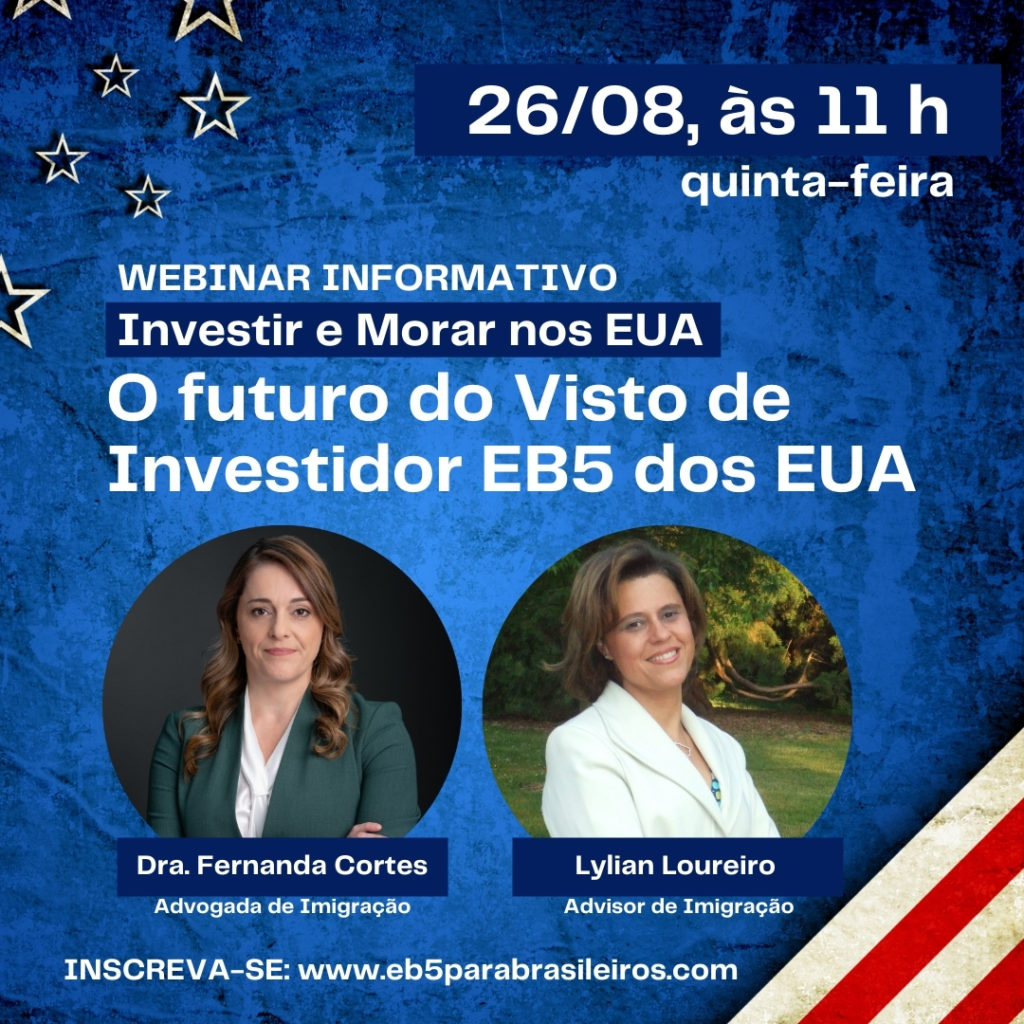 O próximo webinar acontece dia 26 de agosto, quinta-feira, às 11h (horário de Brasília) com a participação especial de advogada de imigração americana. As inscrições já estão abertas no site www.eb5parabrasileiros.com